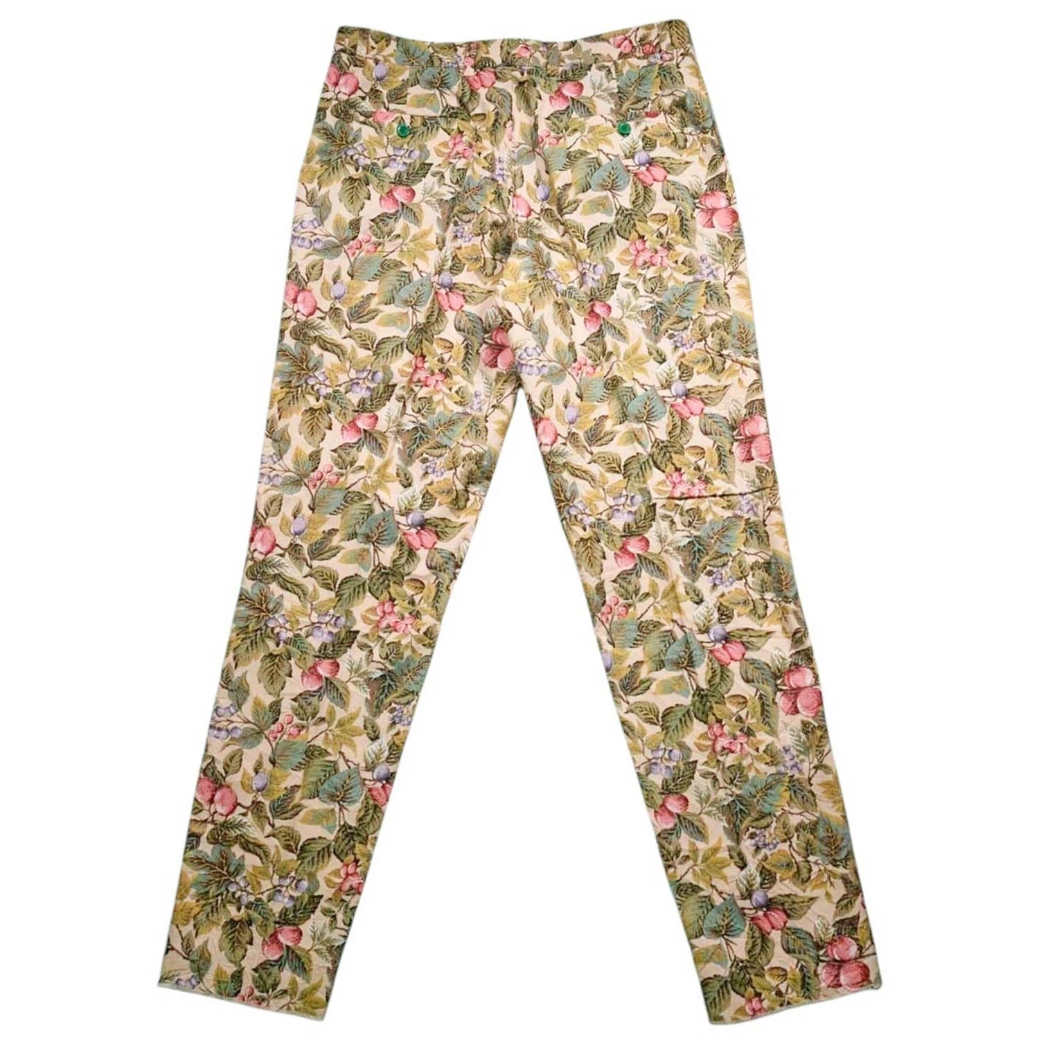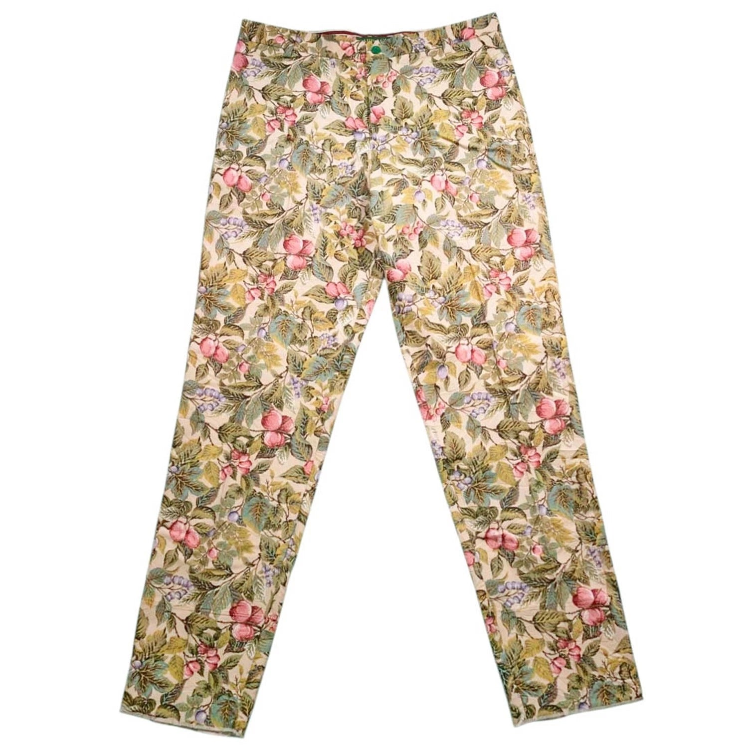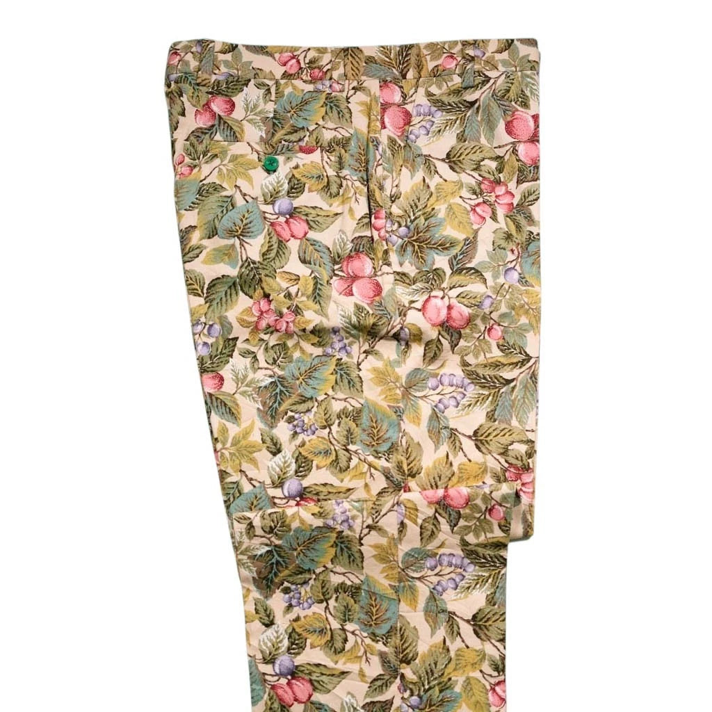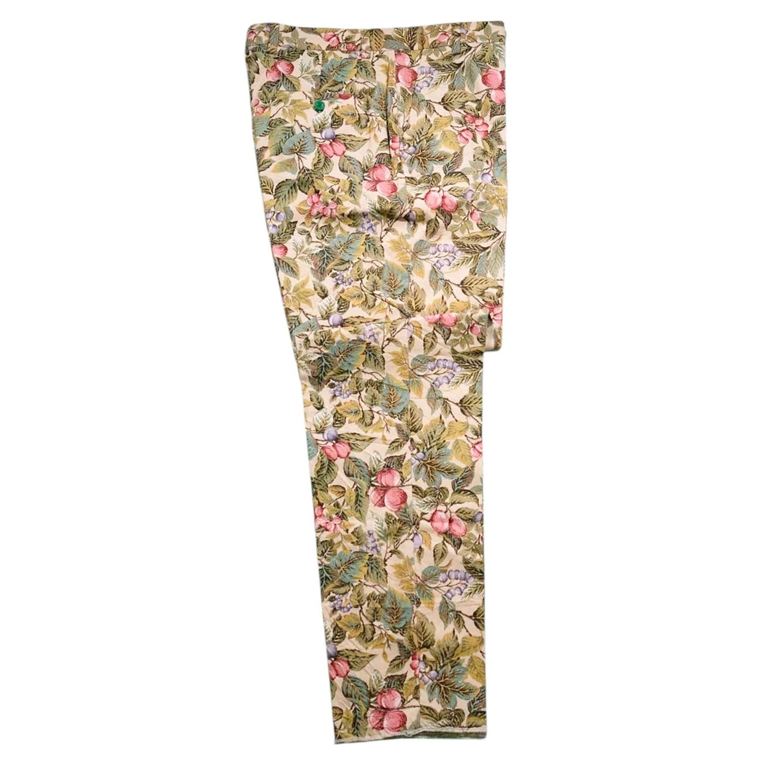 Set on a beige cream base, the pattern features green botanical leaves layered with pink, mauve, purple, and light blue floral and fruit-inspired motifs, creating a lush, garden-style composition. The result is a vibrant, botanical print that feels fresh, artistic, and visually striking. Designed with a flat-front, straight-leg silhouette, these trousers deliver a clean, tailored drape ideal for casual elegance or resort styling.