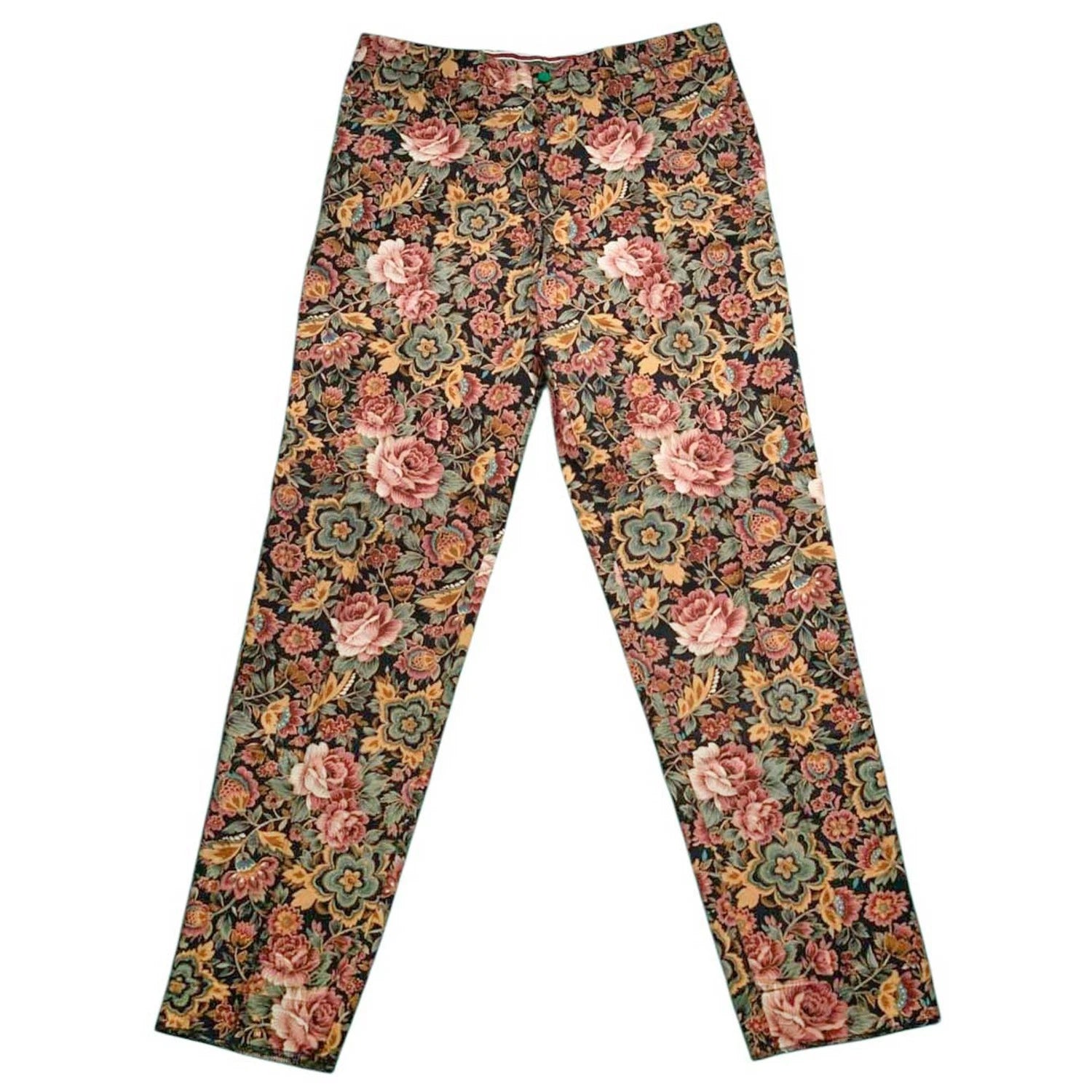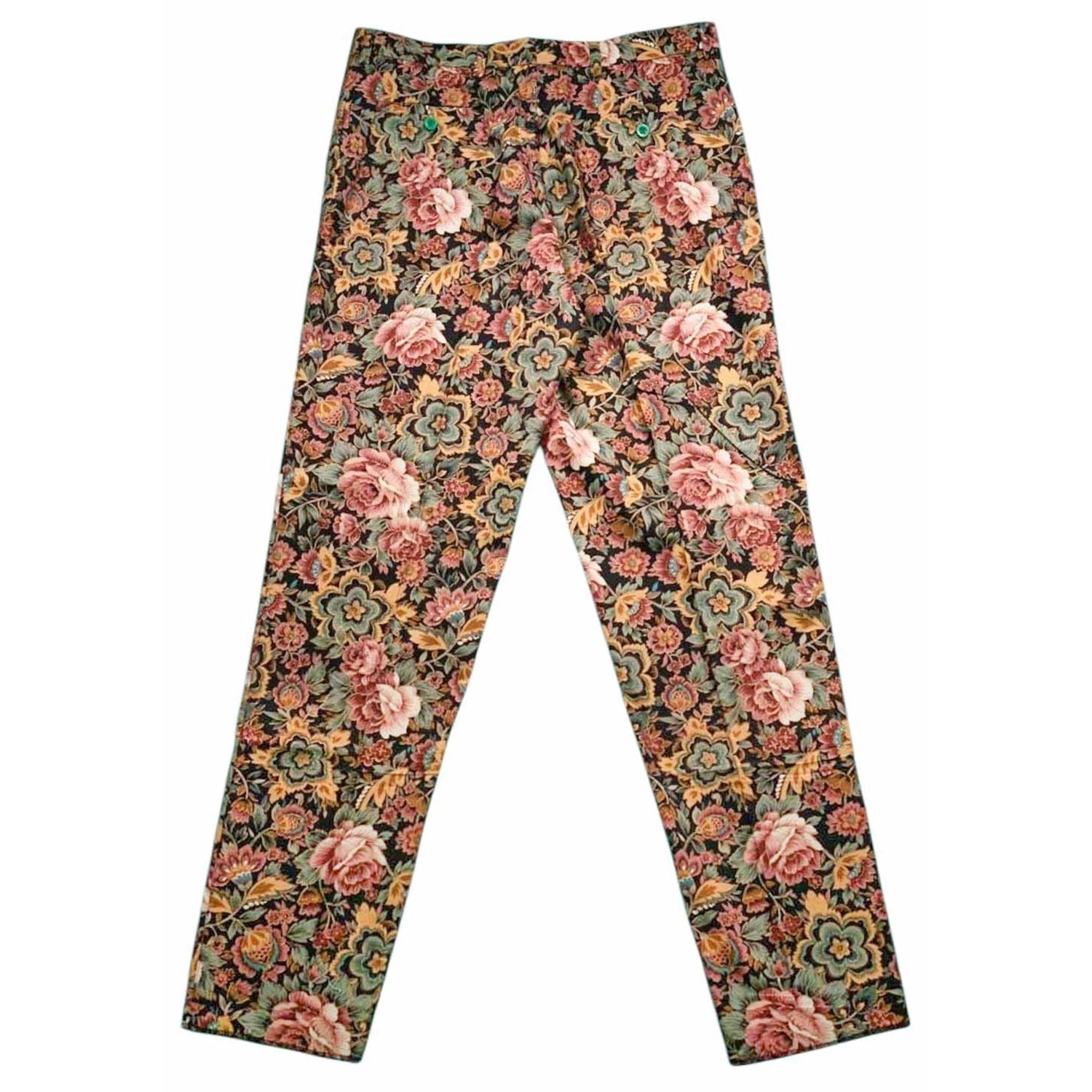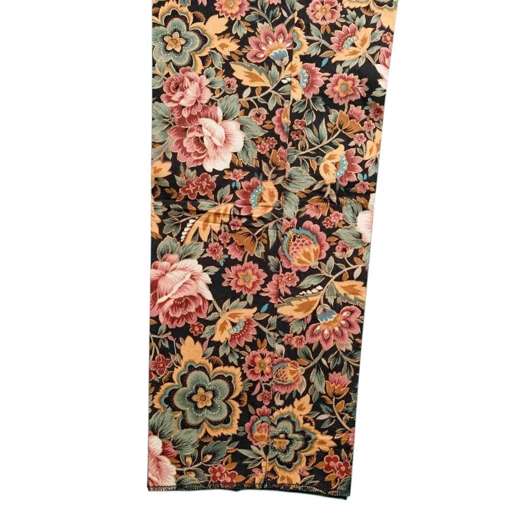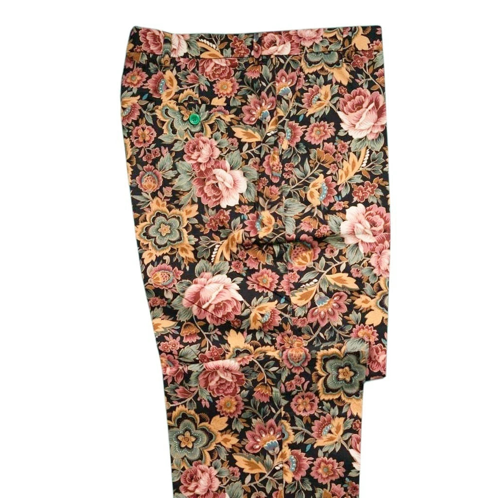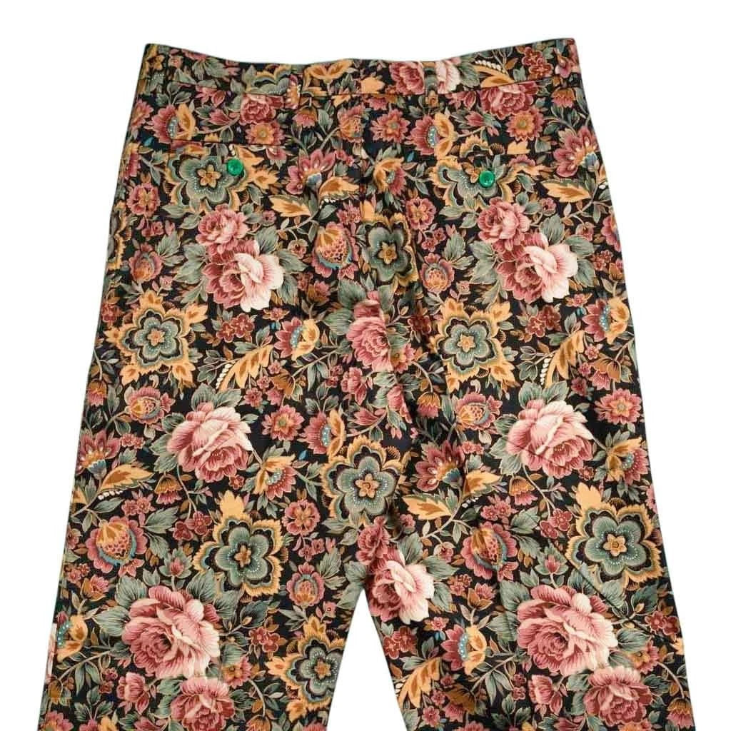 Set on a black base, the pattern features multicolor floral motifs in shades of pink, rose, mustard, sage green, and olive, arranged in a richly detailed botanical layout. The result is a luxurious, tapestry-inspired print that feels elevated, confident, and visually striking. Designed with a flat-front, straight-leg silhouette, these trousers deliver a clean, tailored drape ideal for casual elegance or resort styling.