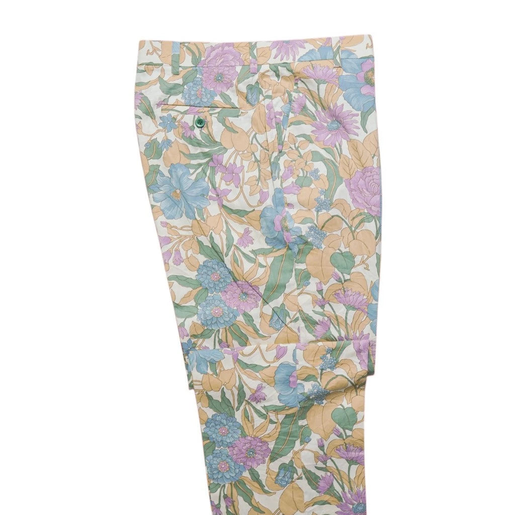 The beige base features a stunning mix of pastel florals in lavender, blue, tan, and sage green, evoking the timeless charm of European garden prints. With a flat-front, straight-leg silhouette, these trousers are designed for the modern gentleman who values artistry, comfort, and tailored elegance.