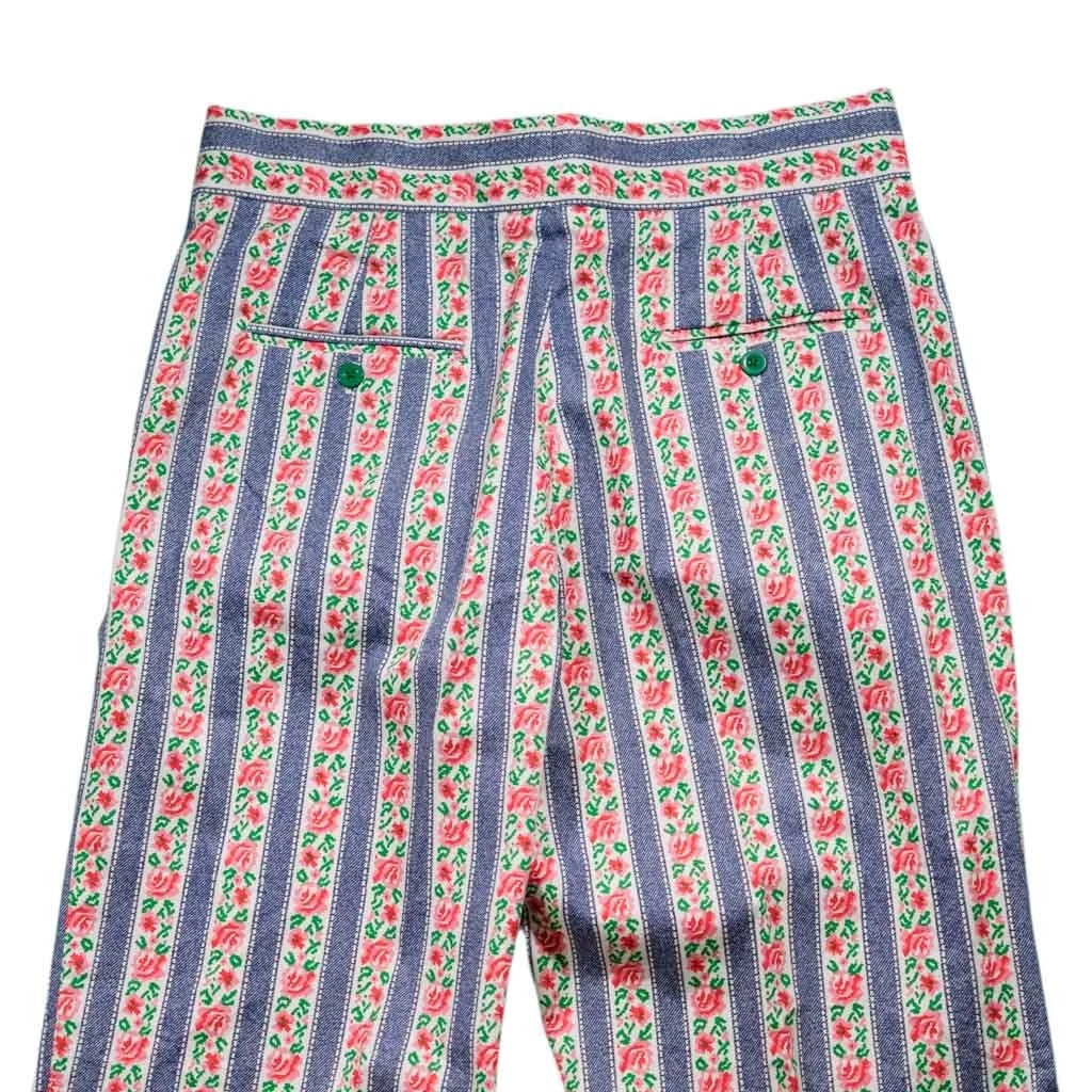 These Men’s Floral Striped Gurkha Pants blend classic military tailoring with expressive, vintage-inspired patterning — a handmade piece designed for men who value individuality, comfort, and standout visual detail. Crafted from lightweight woven cotton, they feature Chiragh’s signature double extended-tab Gurkha waistband and hidden interior suspender buttons, providing authentic adjustability, strong waist shaping, and a clean, tailored front closure.