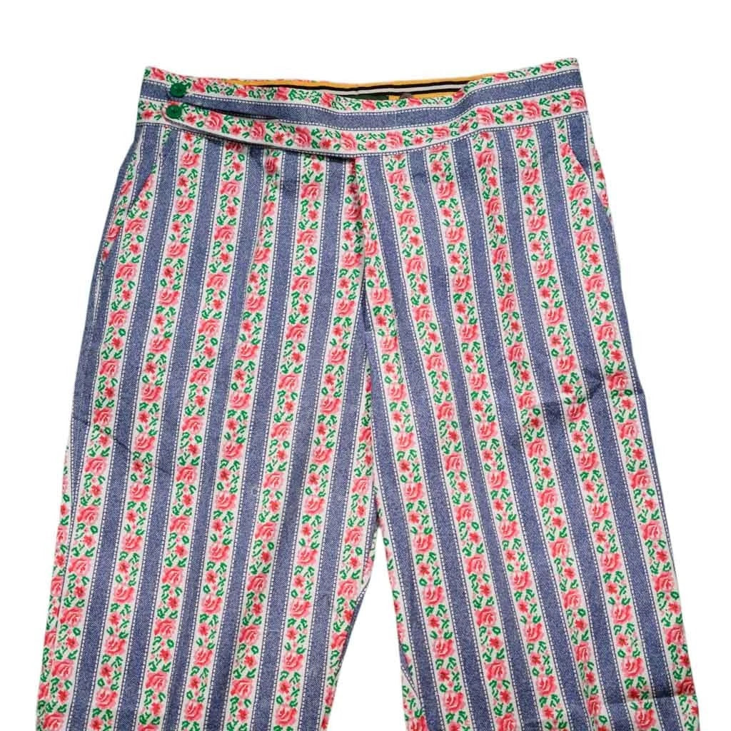 The trousers showcase alternating vertical striped panels — deep navy, soft cream, and panels of pink floral motifs with green accents. This unique blend of stripes and florals delivers a bold, heritage-inspired aesthetic that feels both artistic and refined. Lightweight, breathable, and visually dynamic, these pants offer year-round versatility with a confident silhouette. The flat-front, straight-fit cut ensures smooth drape and polished everyday wear.