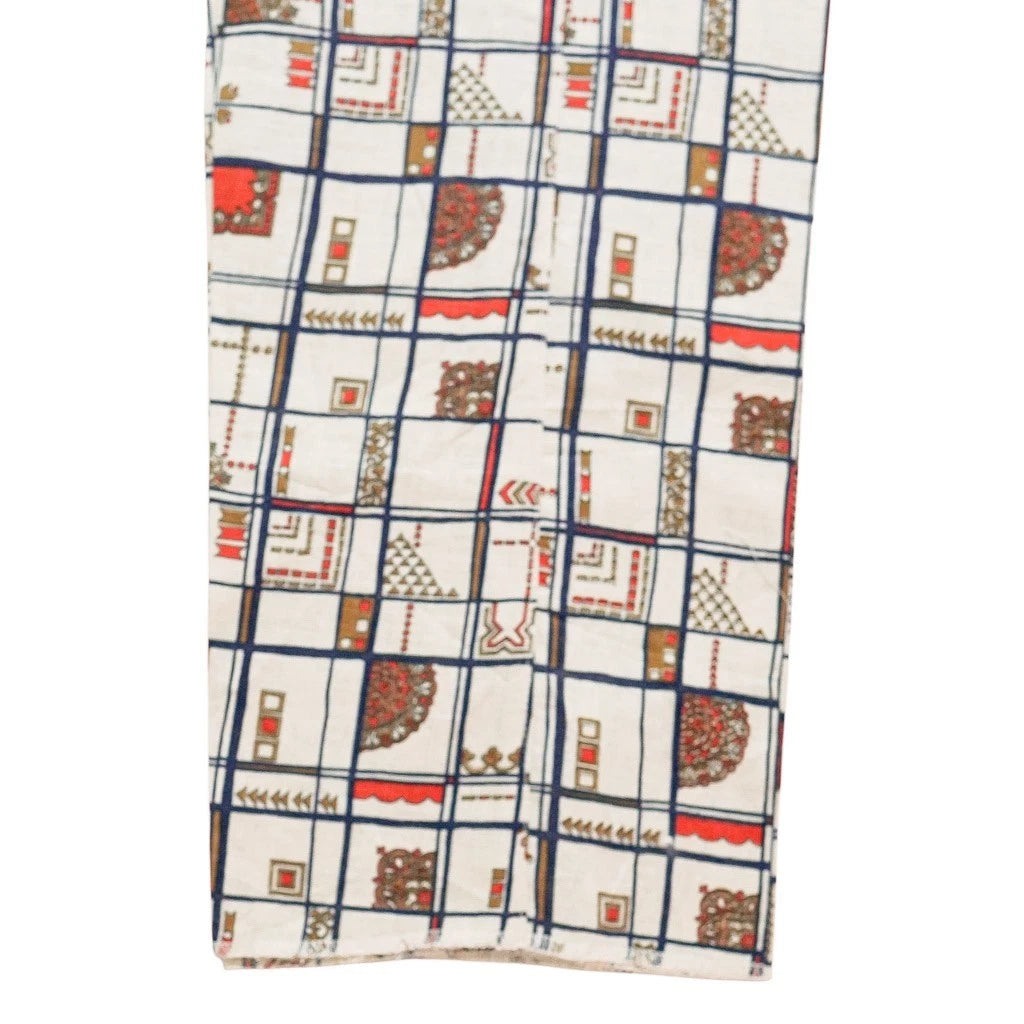 The ivory base is decorated with an intricate multicolor geometric grid pattern, featuring bold navy lines forming structured squares, each filled with a mix of red, gold, and brown motifs — including paisley shapes, miniature medallions, and artisanal decorative elements inspired by traditional textile prints. The result is a statement pattern that remains balanced and wearable thanks to the clean, grid-based structure.