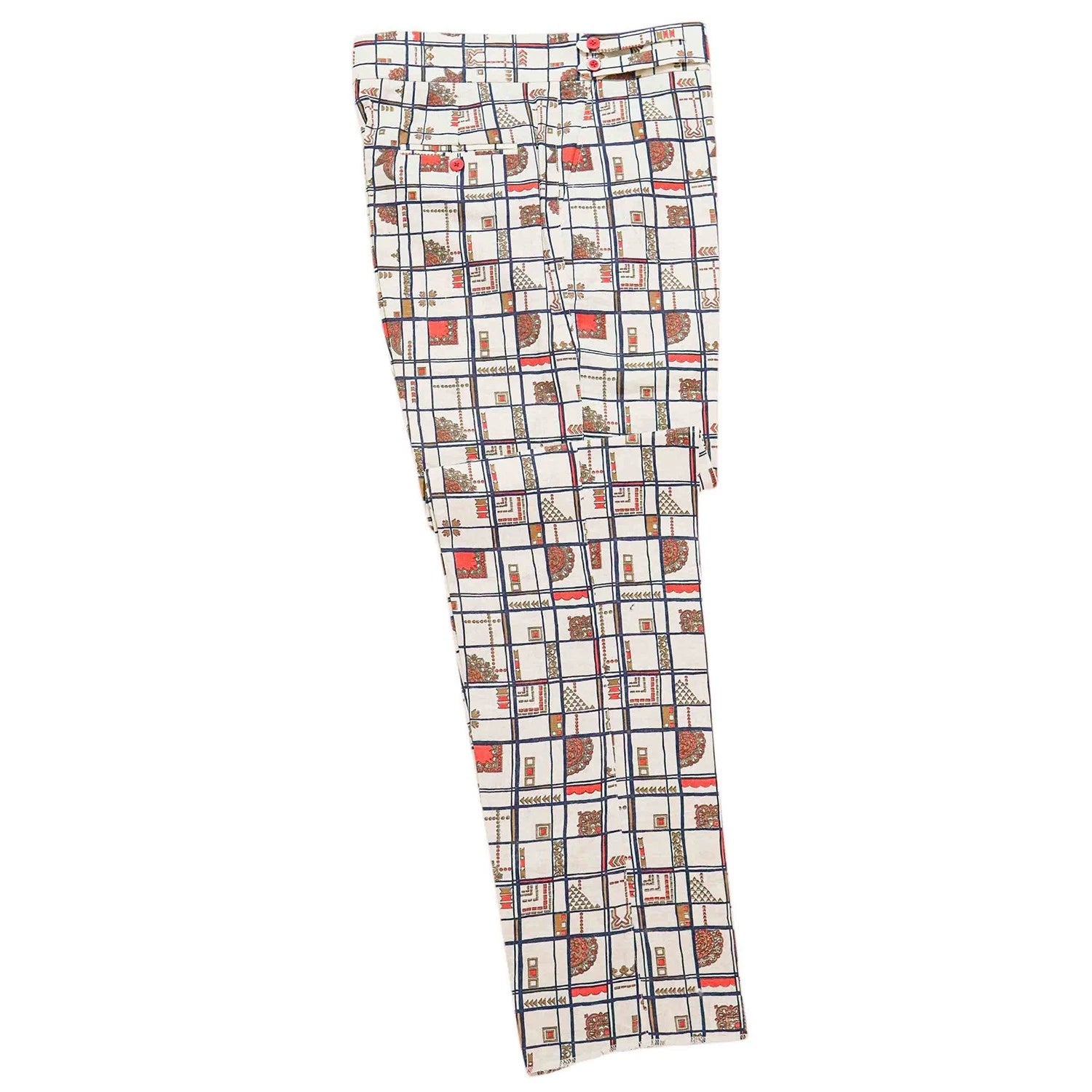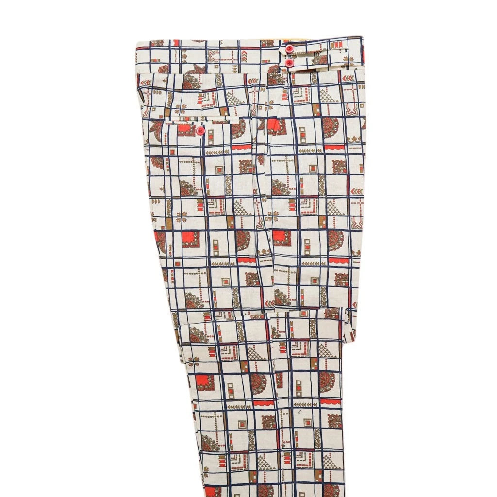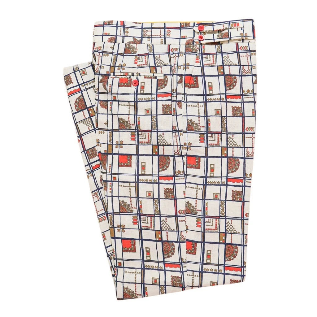 Mens 34 Gurkha Pants Ivory Geometric 100% Cotton Flat Front Straight Fit Handmade