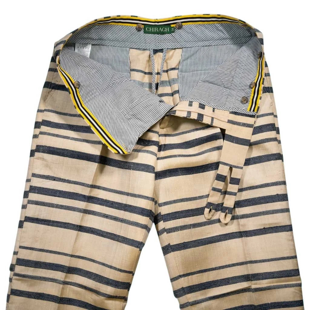 These Men’s Cream Navy Striped Gurkha Pants combine classic military tailoring with the fluid drape and soft hand-feel of textured viscose, creating a handmade piece designed for men who value comfort, movement, and distinctive everyday style. Cut from premium woven viscose, they feature Chiragh’s signature double extended-tab Gurkha waistband and hidden interior suspender buttons, delivering authentic adjustability, strong waist shaping, and a polished front closure.