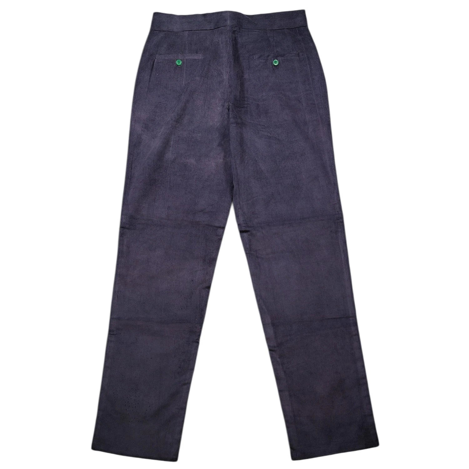 Cut in a deep eggplant purple tone with subtle blue undertones, the color shifts beautifully under different lighting, delivering depth without appearing loud. The corduroy wale texture adds warmth and visual interest, making these trousers ideal for fall and winter dressing as well as elevated evening wear. Finished with a high-waisted, flat-front, straight-fit silhouette, they provide a tailored drape suitable for both formal and refined casual styling.