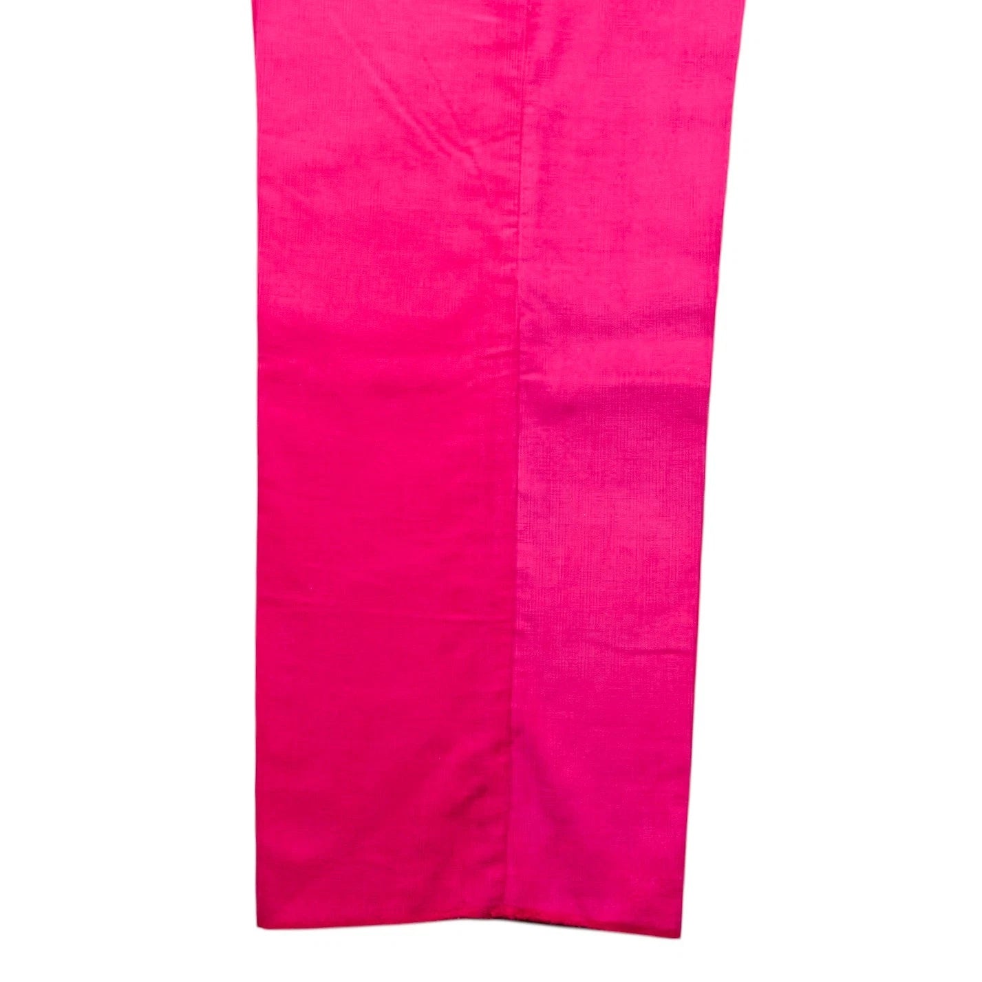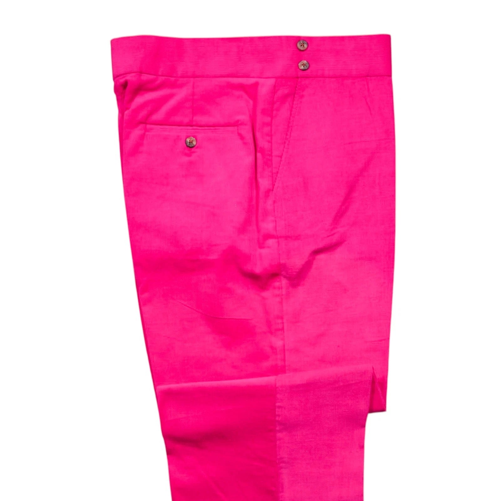 Rendered in a magenta pink tone with cool, slightly purple undertones, the color is bold, saturated, and refined, sitting perfectly between fuchsia and hot pink while remaining distinctly its own. The corduroy wale texture adds depth and warmth, making these trousers ideal for fall and winter dressing, creative styling, and elevated statement looks. Finished with a high-waisted, flat-front, straight-fit silhouette, they deliver a tailored drape that balances vibrant color with timeless structure.