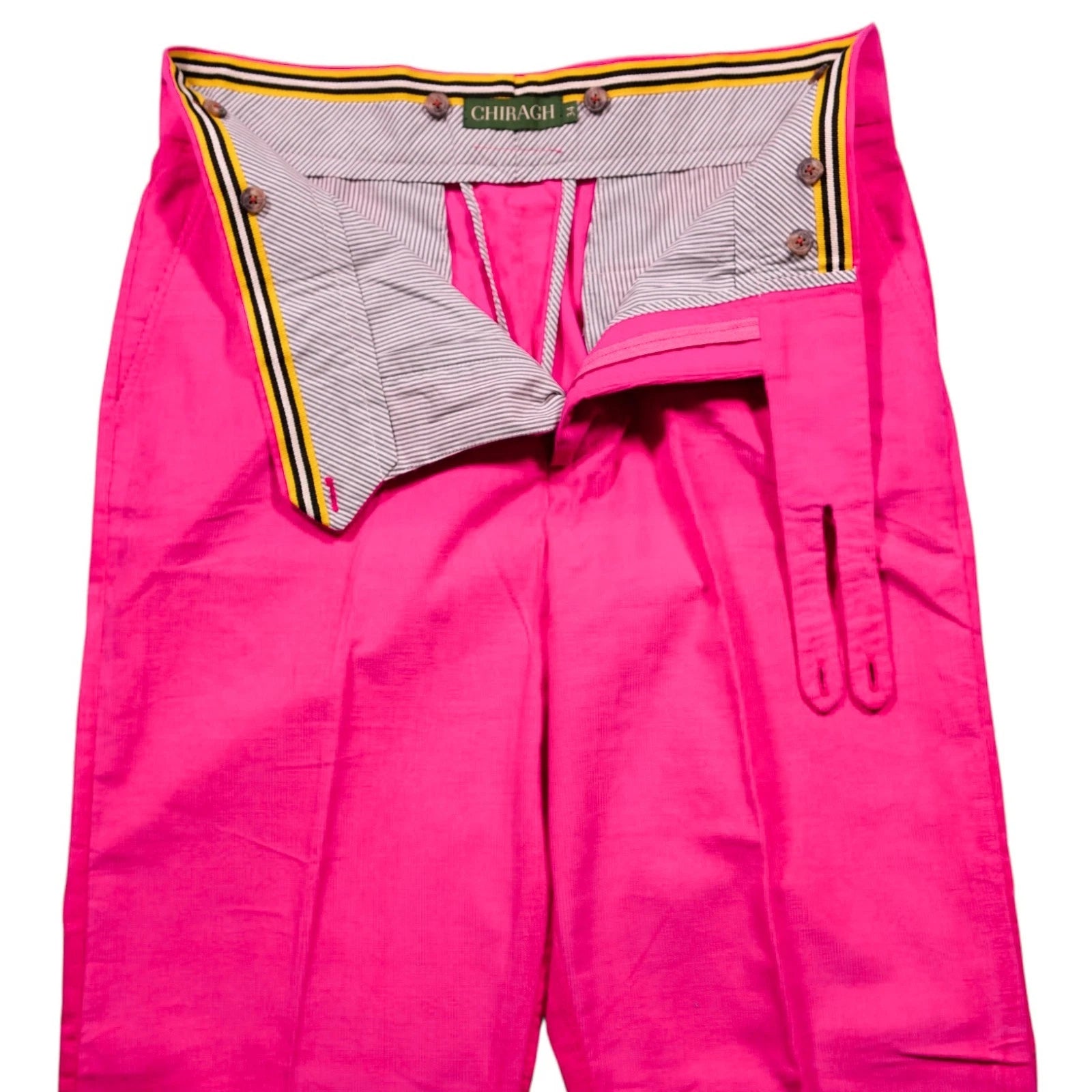 These Men’s Magenta Pink Corduroy Gurkha Pants combine classic menswear tailoring with rich, expressive color and handmade craftsmanship, creating a statement piece for the gentleman who values individuality, texture, and refined construction. Crafted from premium cotton corduroy, they feature an authentic double extended-tab Gurkha waistband with hidden interior suspender buttons, offering adjustability and support while maintaining a clean, uninterrupted front.