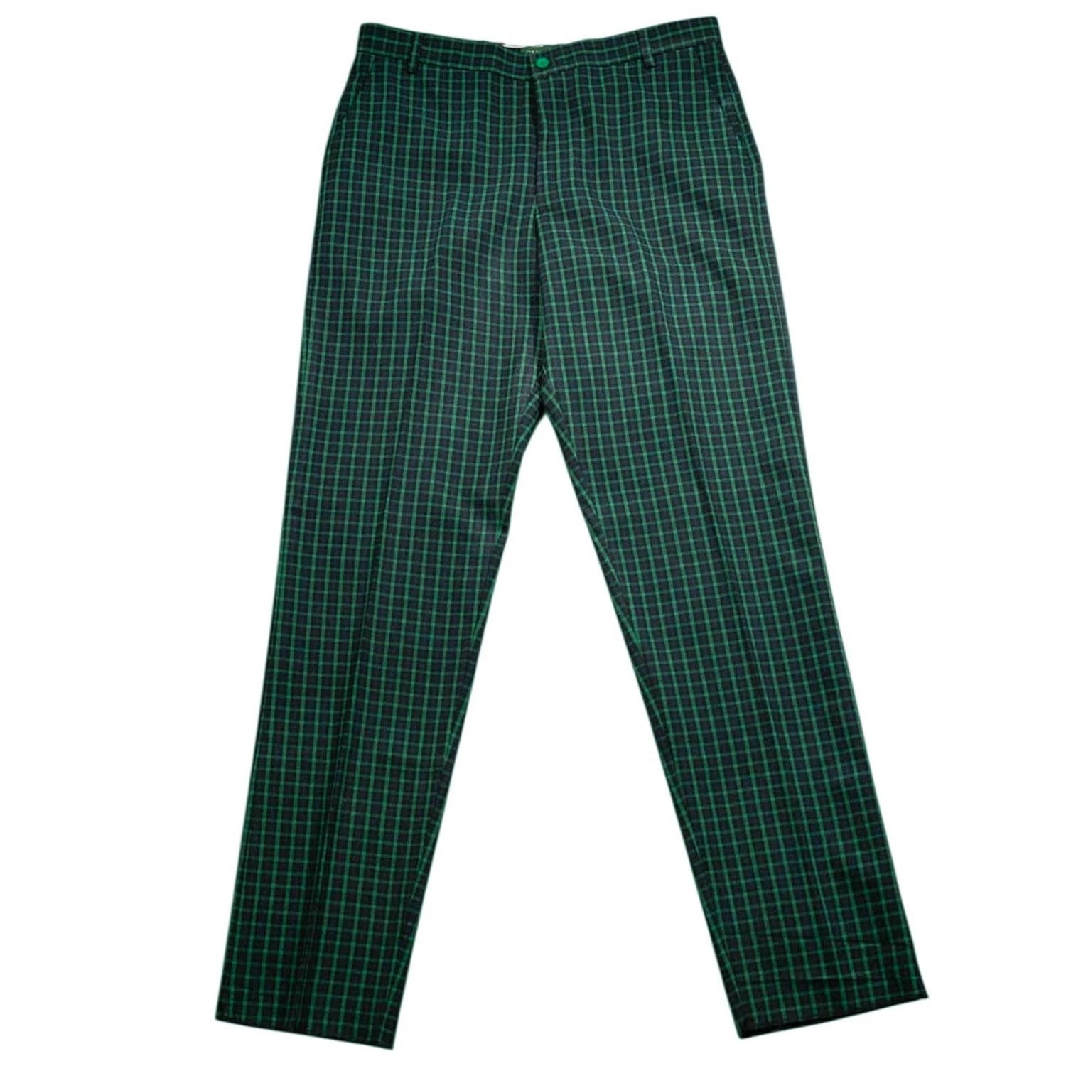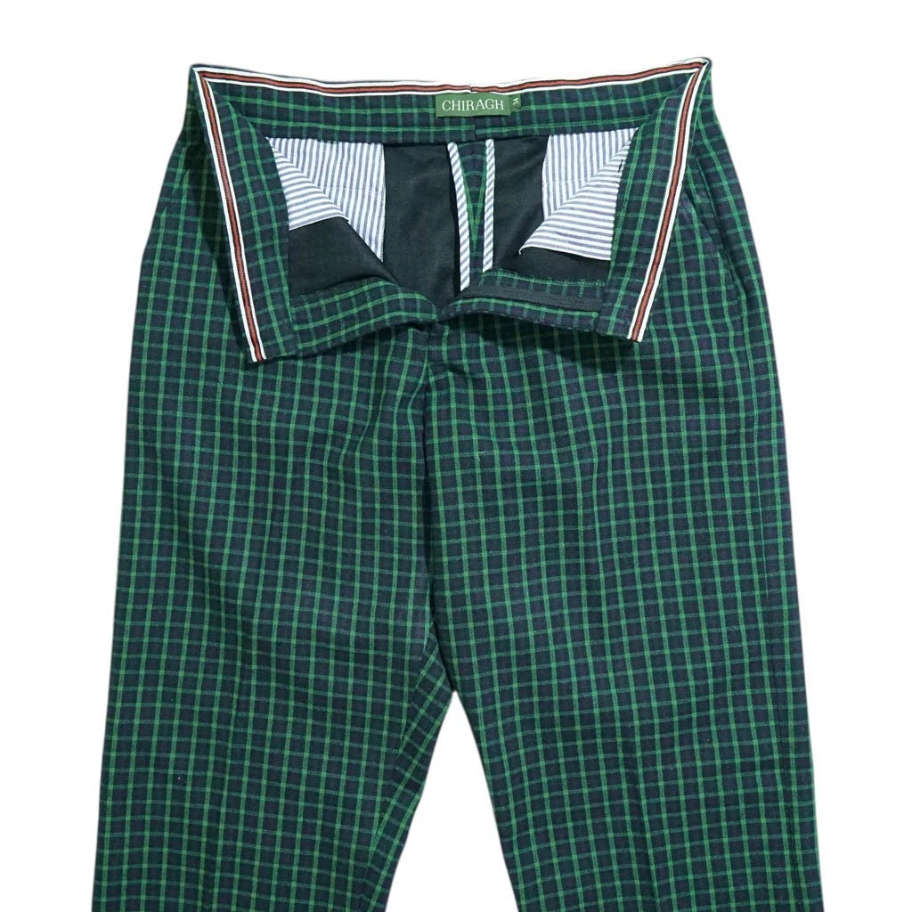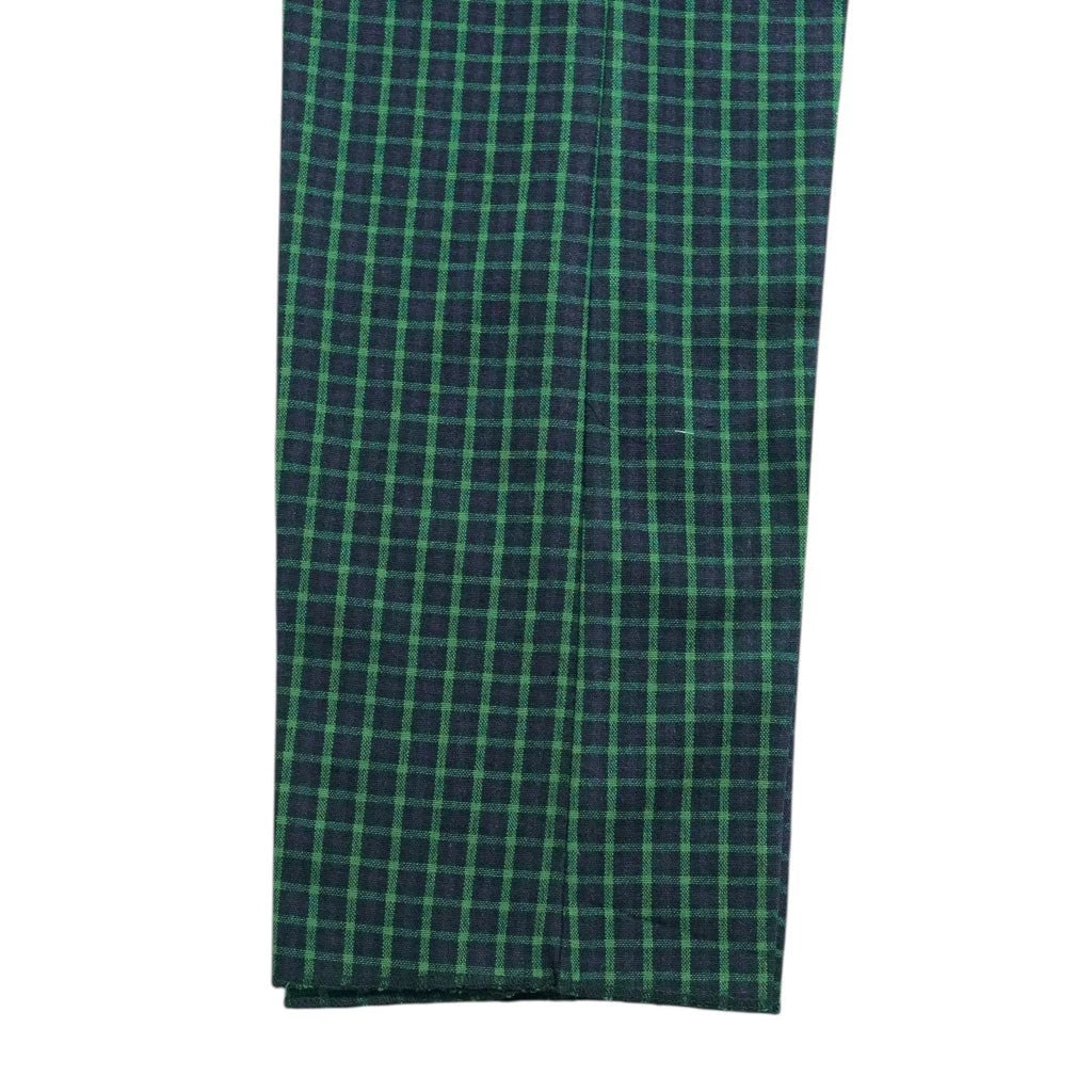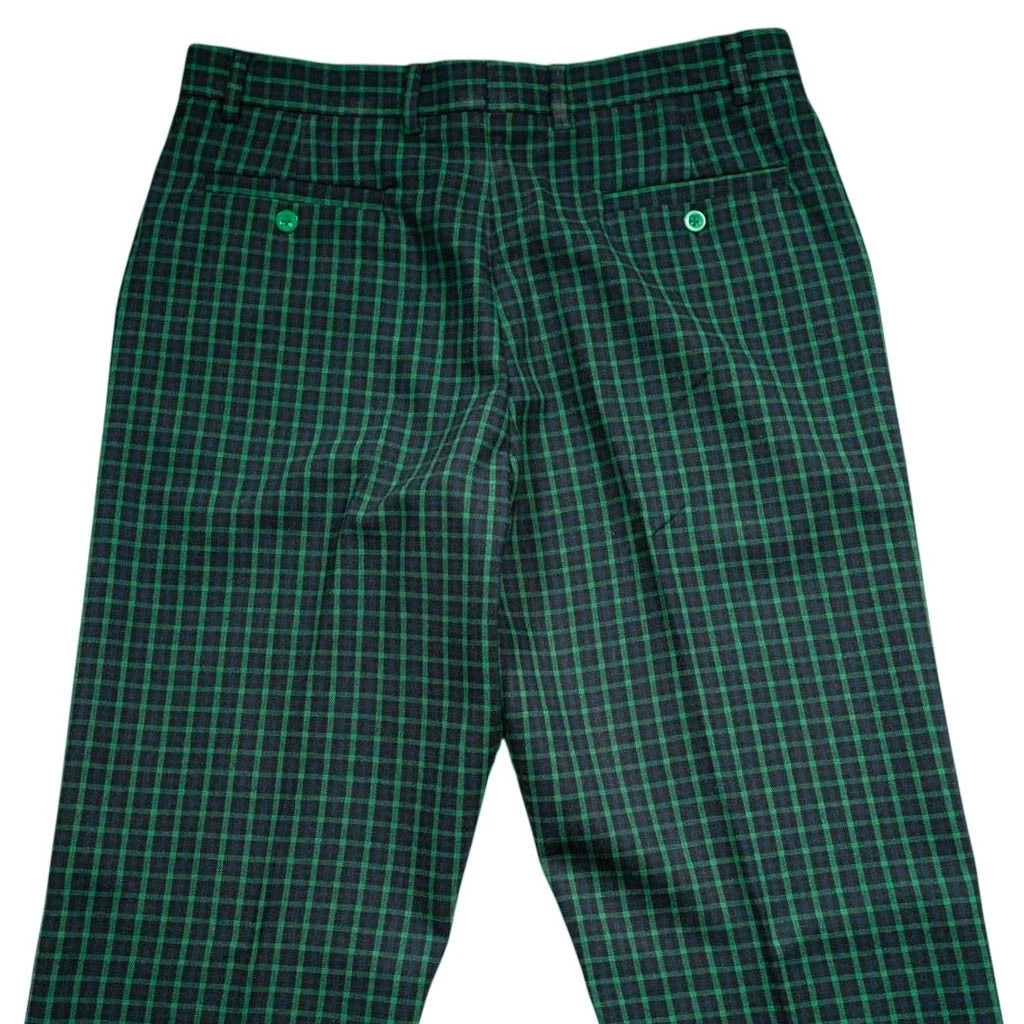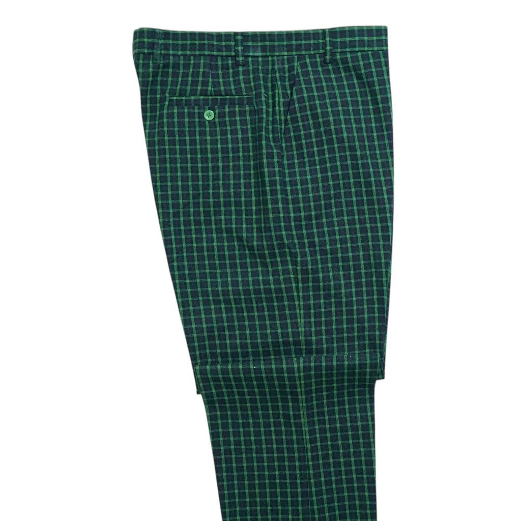 Designed in a deep green and navy check plaid, this pattern features a small-scale tartan-inspired grid, giving the trousers a clean, refined look. The result is a timeless, understated plaid that feels versatile, classic, and easy to style. Cut in a flat-front, straight-leg silhouette, these trousers deliver a crisp, tailored drape ideal for smart-casual, evening, or elevated everyday wear.