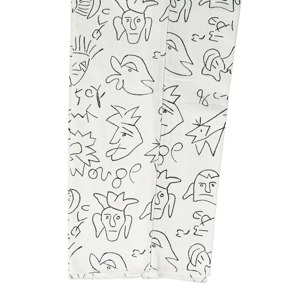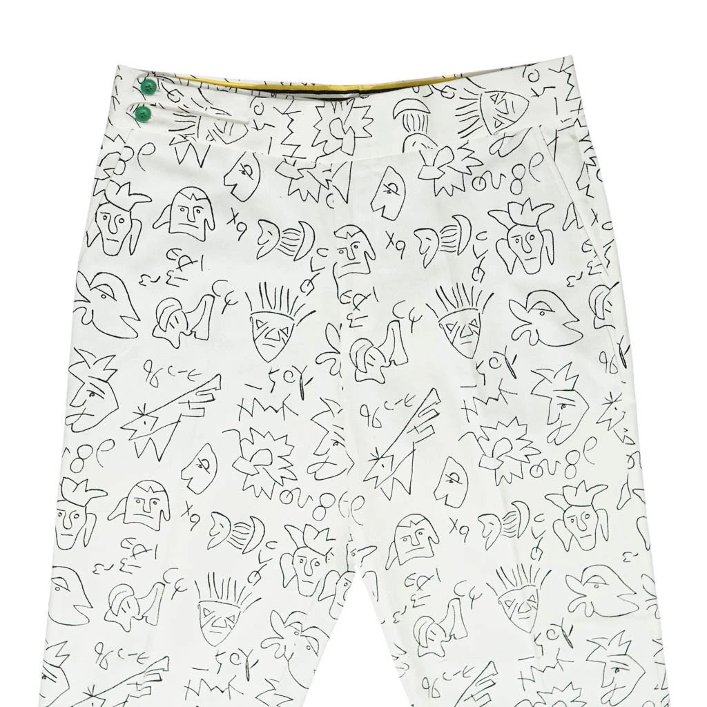 The standout feature is the high-rise cummerbund waistband, finished with extended tab closures that sculpt the waist and add architectural structure to your silhouette. Discreetly placed suspender buttons offer an additional layer of classic refinement and versatile styling. Designed with a straight fit, these trousers create a clean, elongating line that flatters without restricting movement. The ivory and black abstract art print makes a powerful impression—sophisticated, artistic, and unapologetically bold.