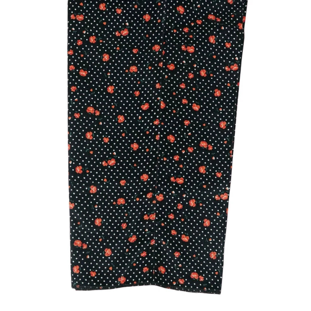 Color: Black Base with an Orange and Green Floral Print accented by White Polka Dots