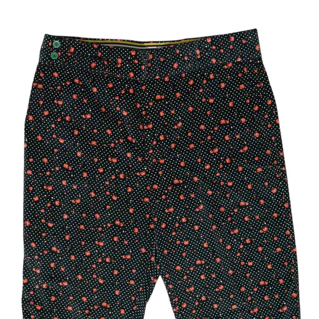 The standout feature is the high-rise cummerbund waistband, finished with extended tab closures that sculpt the waist and add architectural structure to your silhouette. Discreetly placed suspender buttons offer an additional layer of classic refinement and versatile styling. Designed with a straight fit, these trousers create a clean, elongating line that flatters without restricting movement. The black base with an orange and green floral print accented by white polka dots creates a striking look—sophisticated, artistic, and unapologetically bold.