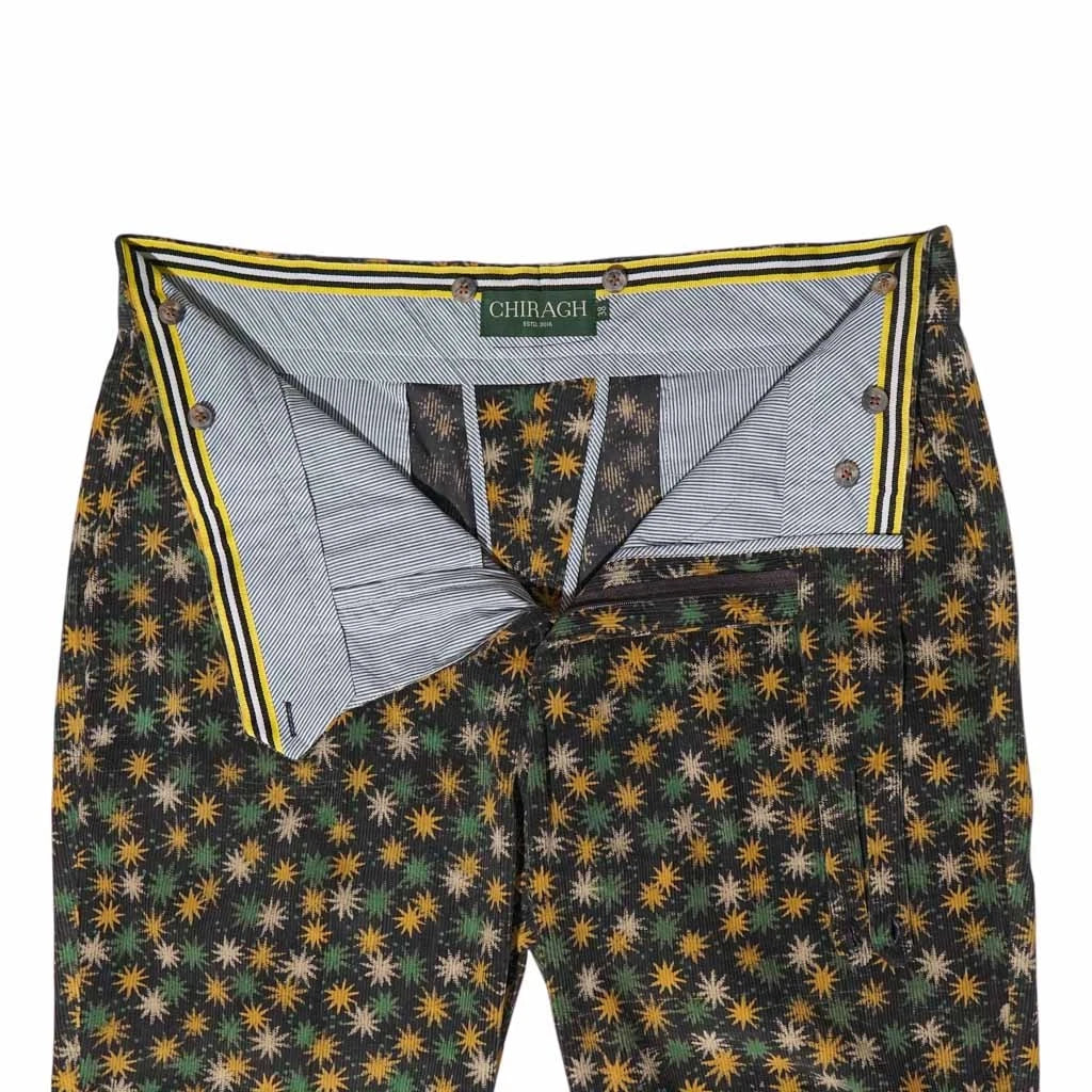 Brown, Orange, & Green Abstract Floral Gurkha Pants – Handmade Designer Trousers for Men | 100% Cotton Corduroy by Chiragh