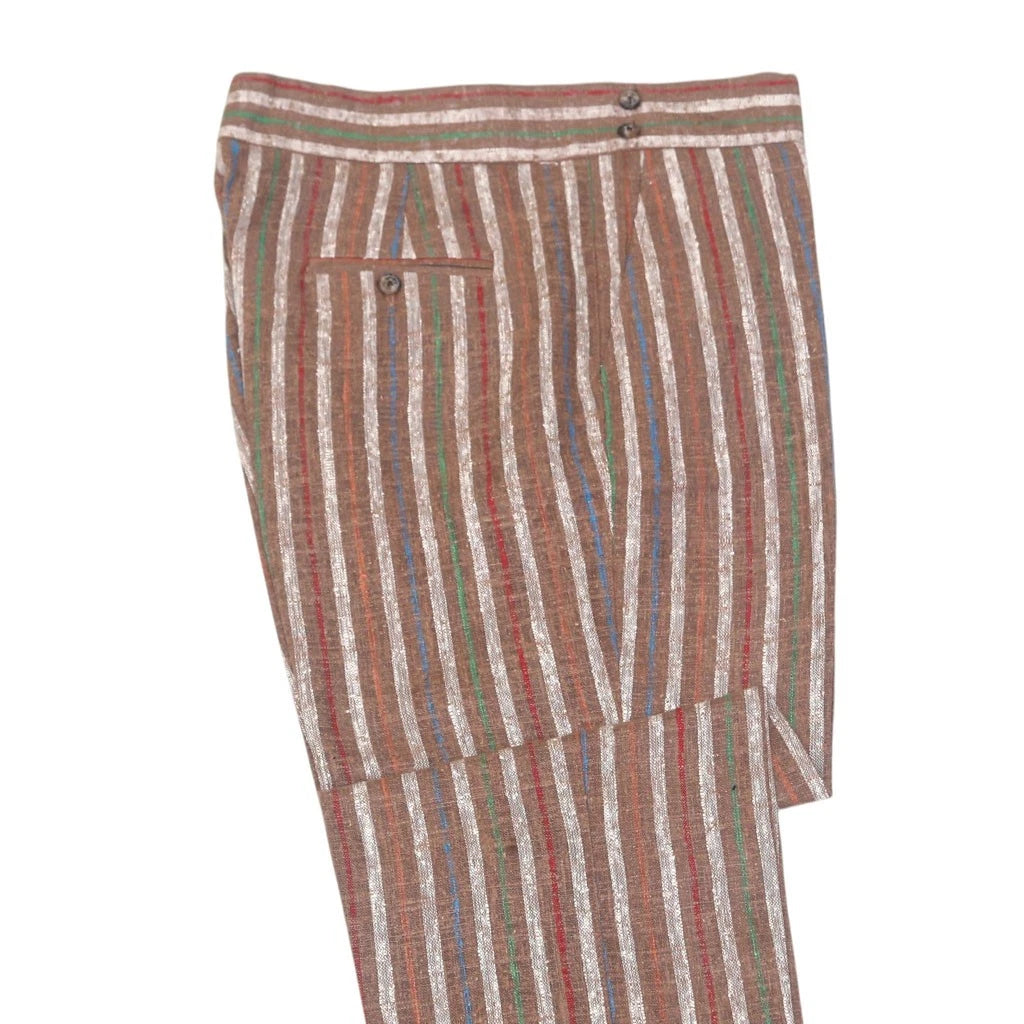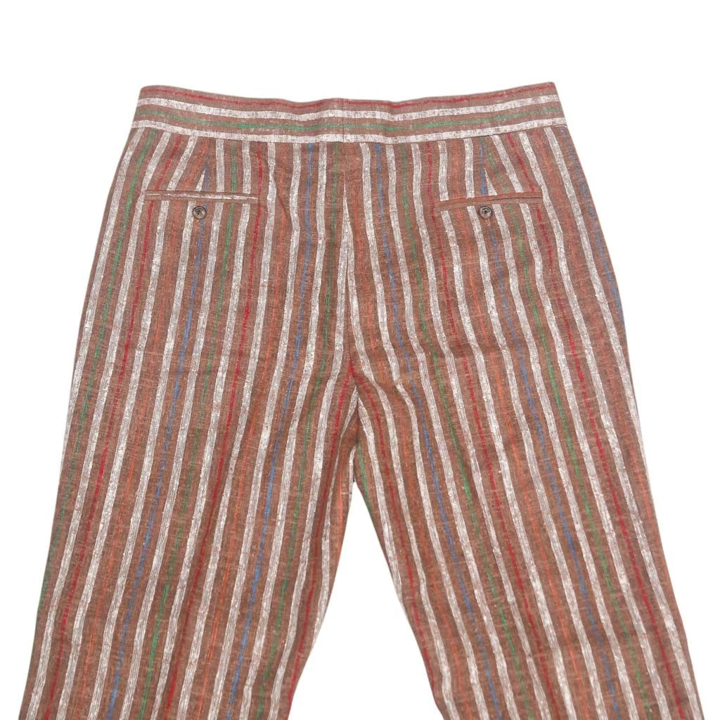 The standout feature is the high-rise cummerbund waistband, finished with extended tab closures that sculpt the waist and add architectural structure to your silhouette. Discreetly placed suspender buttons offer an additional layer of classic refinement and versatile styling. Designed with a straight fit, these trousers create a clean, elongating line that flatters without restricting movement. The brown base layered with a multicolor striped print makes a powerful impression—sophisticated, artistic, and unapologetically bold.