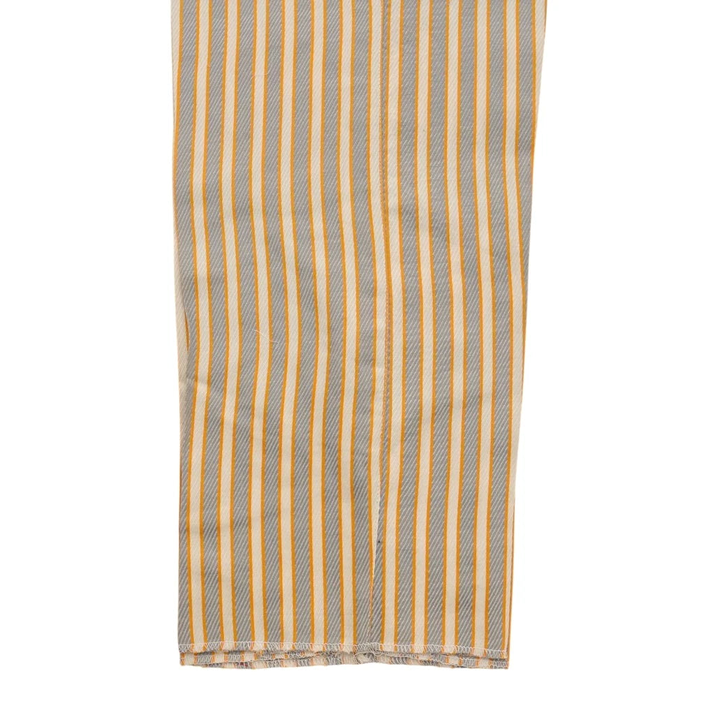 The standout feature is the high-rise cummerbund waistband, finished with extended tab closures that sculpt the waist and add architectural structure to your silhouette. Discreetly placed suspender buttons offer an additional layer of classic refinement and versatile styling. Designed with a straight fit, these trousers create a clean, elongating line that flatters without restricting movement. The orange, beige, and gray striped print makes a powerful impression—sophisticated, artistic, and unapologetically bold.