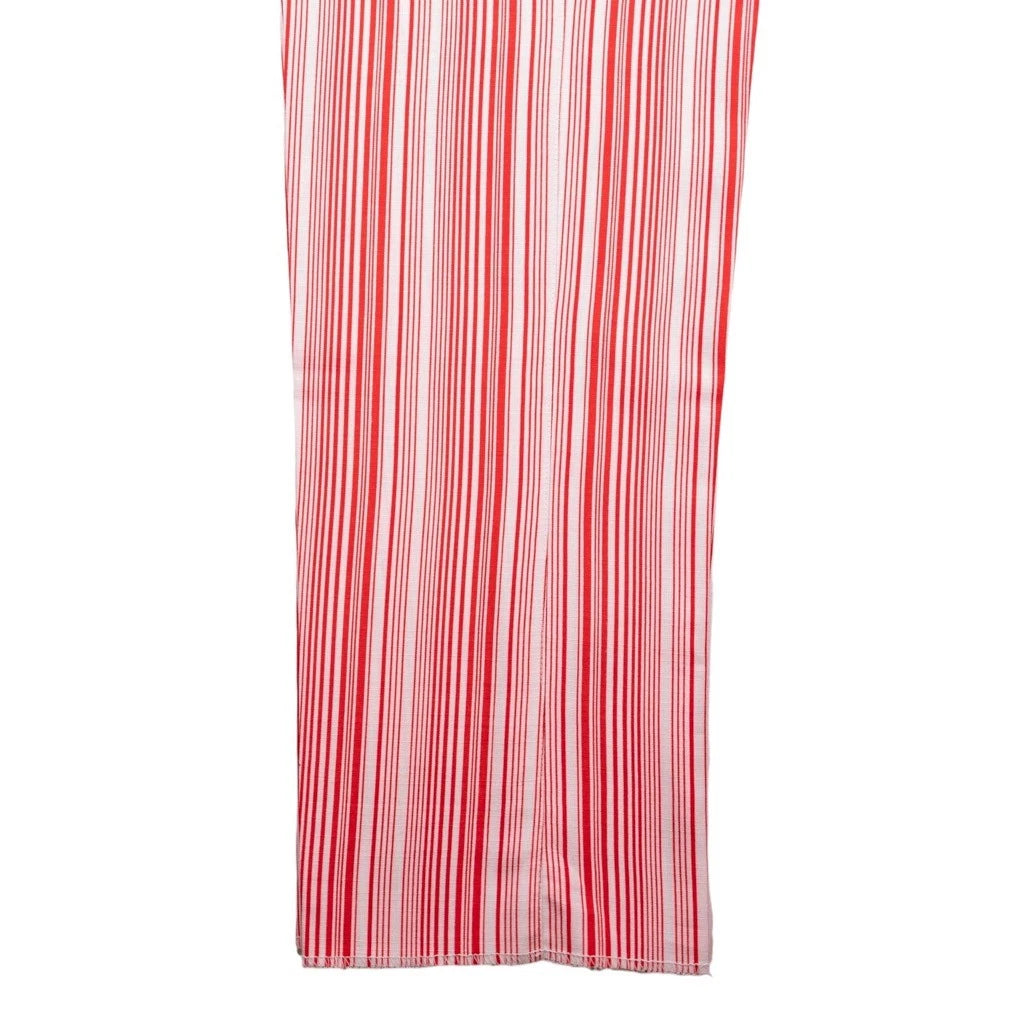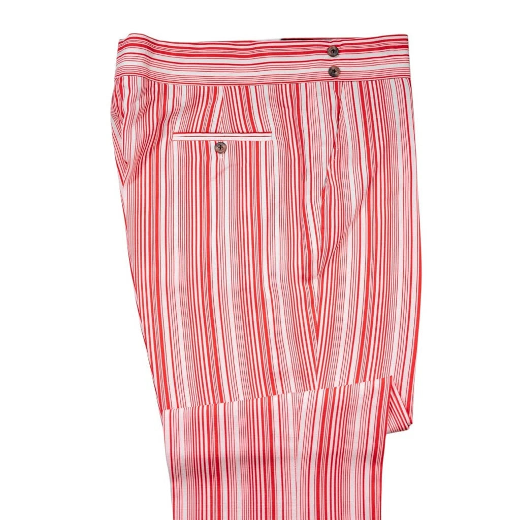 The standout feature is the high-rise cummerbund waistband, finished with extended tab closures that sculpt the waist and add architectural structure to your silhouette. Discreetly placed suspender buttons offer an additional layer of classic refinement and versatile styling. Designed with a straight fit, these trousers create a clean, elongating line that flatters without restricting movement. The red and white striped print makes a powerful impression—sophisticated, artistic, and unapologetically bold.