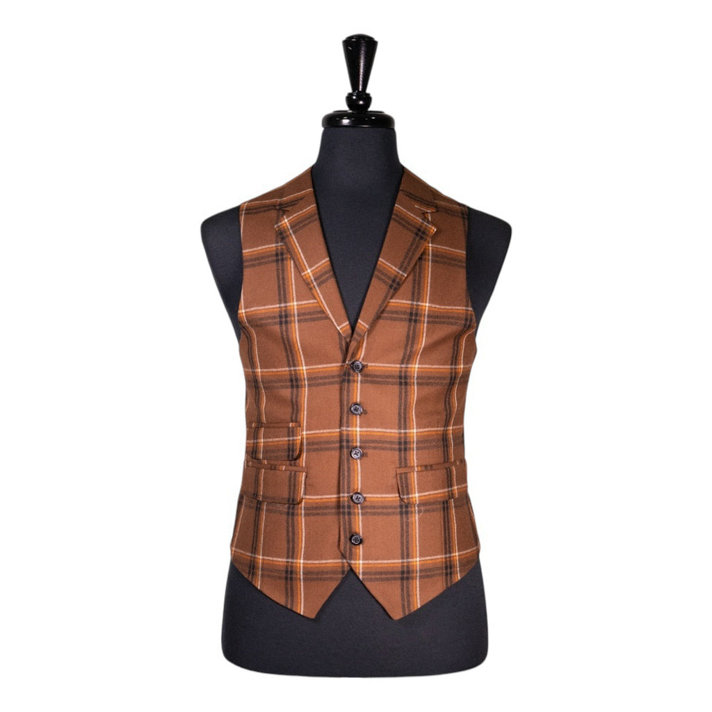 Elevate your style with our luxurious brown and orange plaid check waistcoat, a perfect blend of vintage sophistication and modern elegance. Crafted from premium wool, this single-breasted vest is designed for those who appreciate timeless fashion and impeccable tailoring.